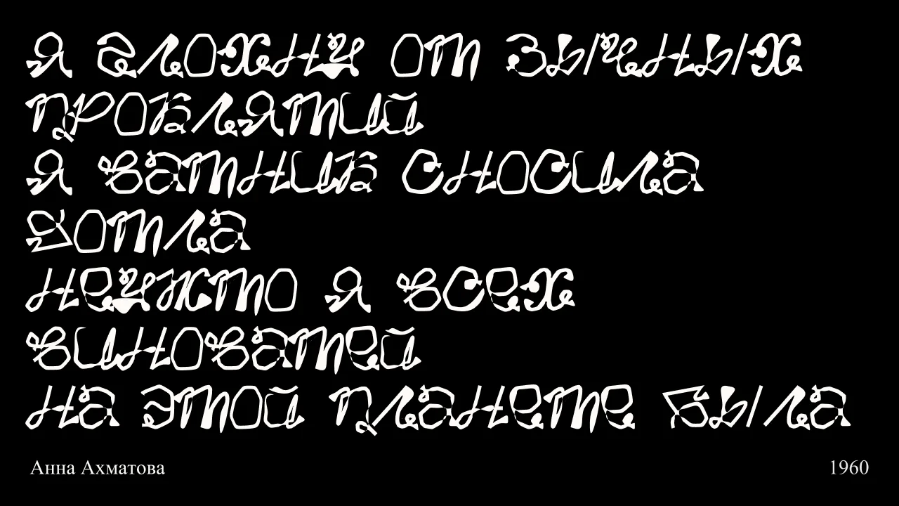 The persona of Anna Akhmatova (née Gorenko), one of the most prominent Russian poets of the 20th century, inspired the creation of this typeface. The curves and breaks in her verses became the foundation for letters that seem to "writhe" in the anguish of history yet remain resilient and readable. I hope I have succeeded in capturing the spirit of fractured human destinies that Akhmatova so poignantly celebrated in her work